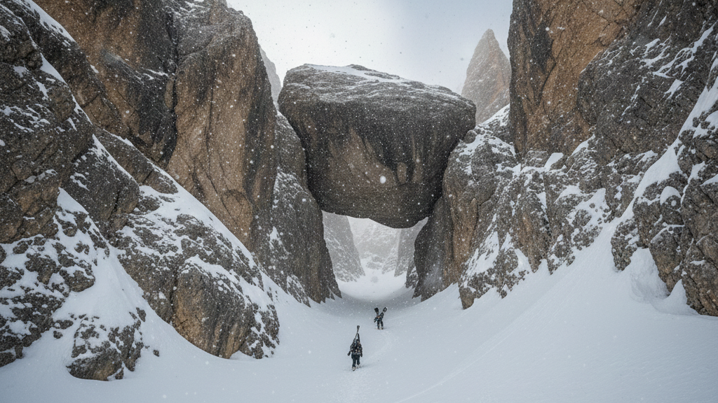 Bratři objevili linii pomocí dronu a byli fascinováni její estetikou – úzký žlab, který v jedné části prochází pod obřím balvanem tvořícím bránu [05:32]. Den D začal brzy ráno, ale podmínky se začaly rychle měnit. Do stěny se natáhla mlha a začalo sněžit [08:46]. Navzdory tomu se rozhodli pokračovat, motivováni vidinou unikátního sjezdu.